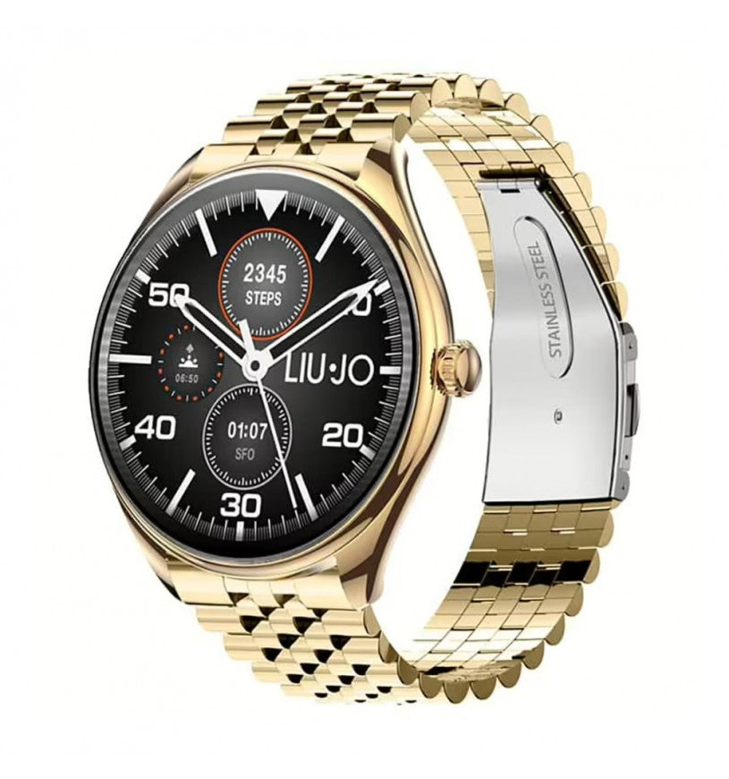 Il Liu Jo SWLJ161, parte della collezione Voice Man, è uno smartwatch da uomo che unisce eleganza e funzionalità in un unico dispositivo dal design deciso e contemporaneo. Con cassa in lega di zinco e acciaio dorato da 45 mm, è pensato per chi vuole restare connesso senza rinunciare allo stile.