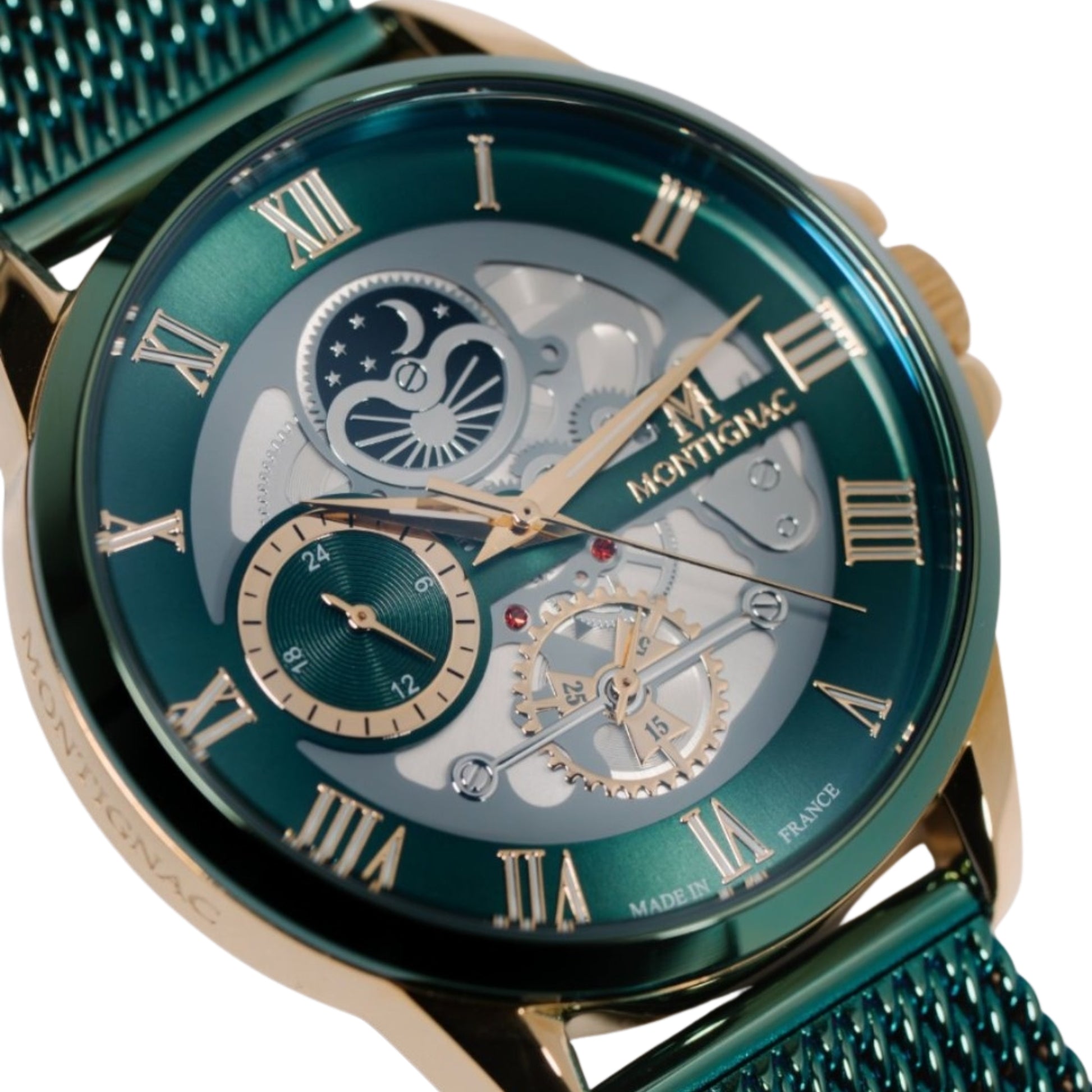 Il Montignac MOW1101, progettato e assemblato in Francia, è un orologio dal carattere deciso e moderno che celebra l’essenza della collezione Origine. Questa creazione esclusiva unisce un’estetica ispirata agli anni ’70 con elementi contemporanei, come il bracciale in maglia milanese e l’elegante quadrante scheletrato verde viridità, una tonalità distintiva che ne rafforza l’identità.