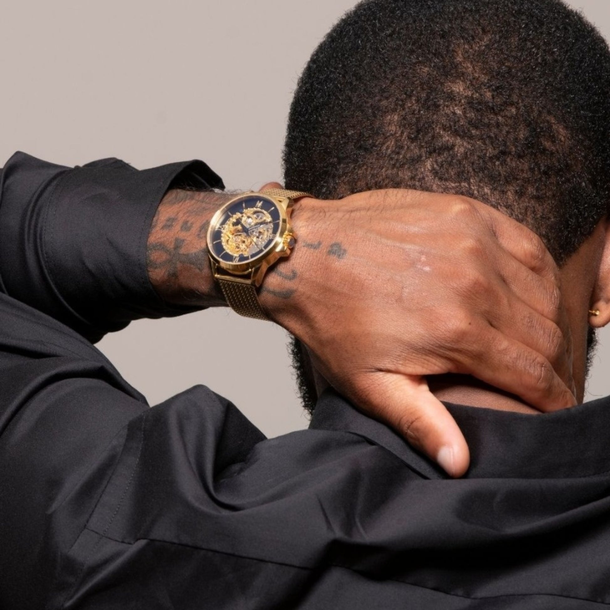 Il quadrante nero con movimento automatico scheletrato dorato a vista offre uno spettacolo tecnico raffinato, permettendo di osservare gli ingranaggi del meccanismo in azione. Le tre lancette dorate garantiscono una lettura chiara e armoniosa, perfettamente integrata nel design.