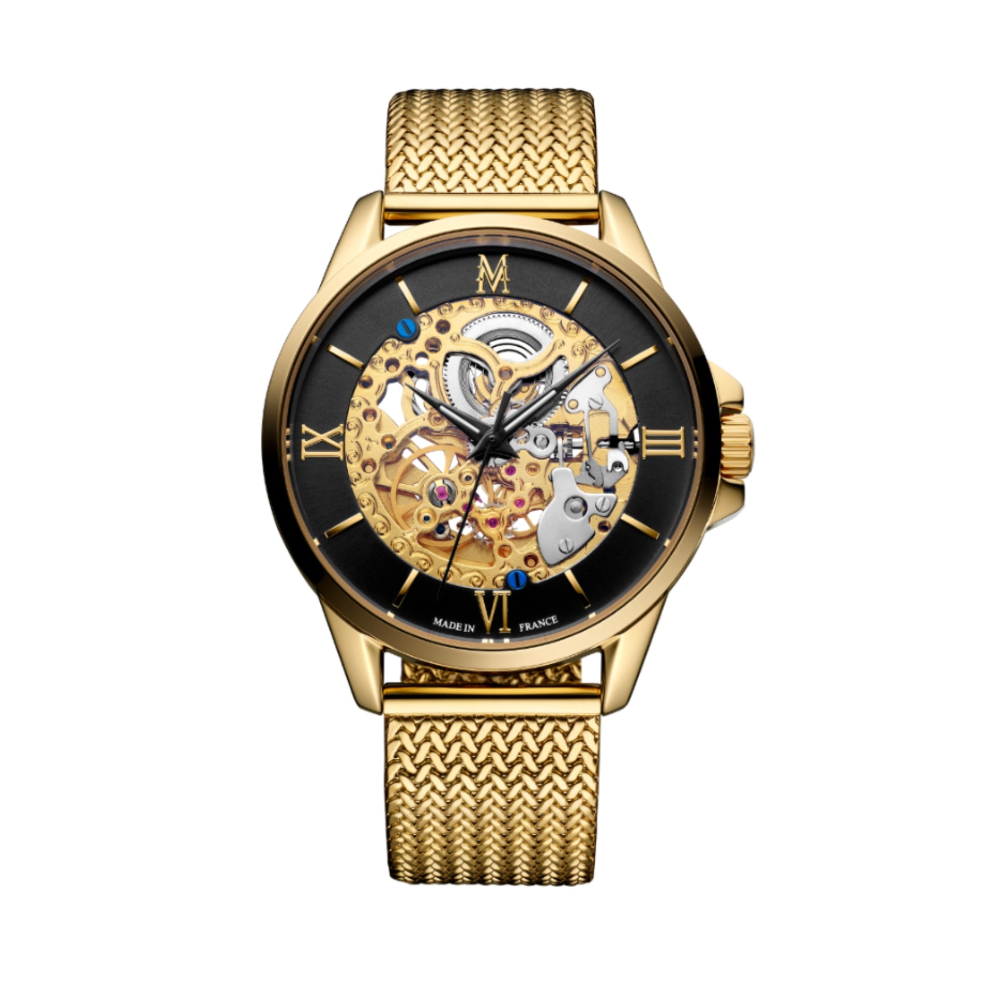 Montignac Origine – Round MOW407 – Orologio Automatico da Uomo in Acciaio Oro con Quadrante Nero Scheletrato