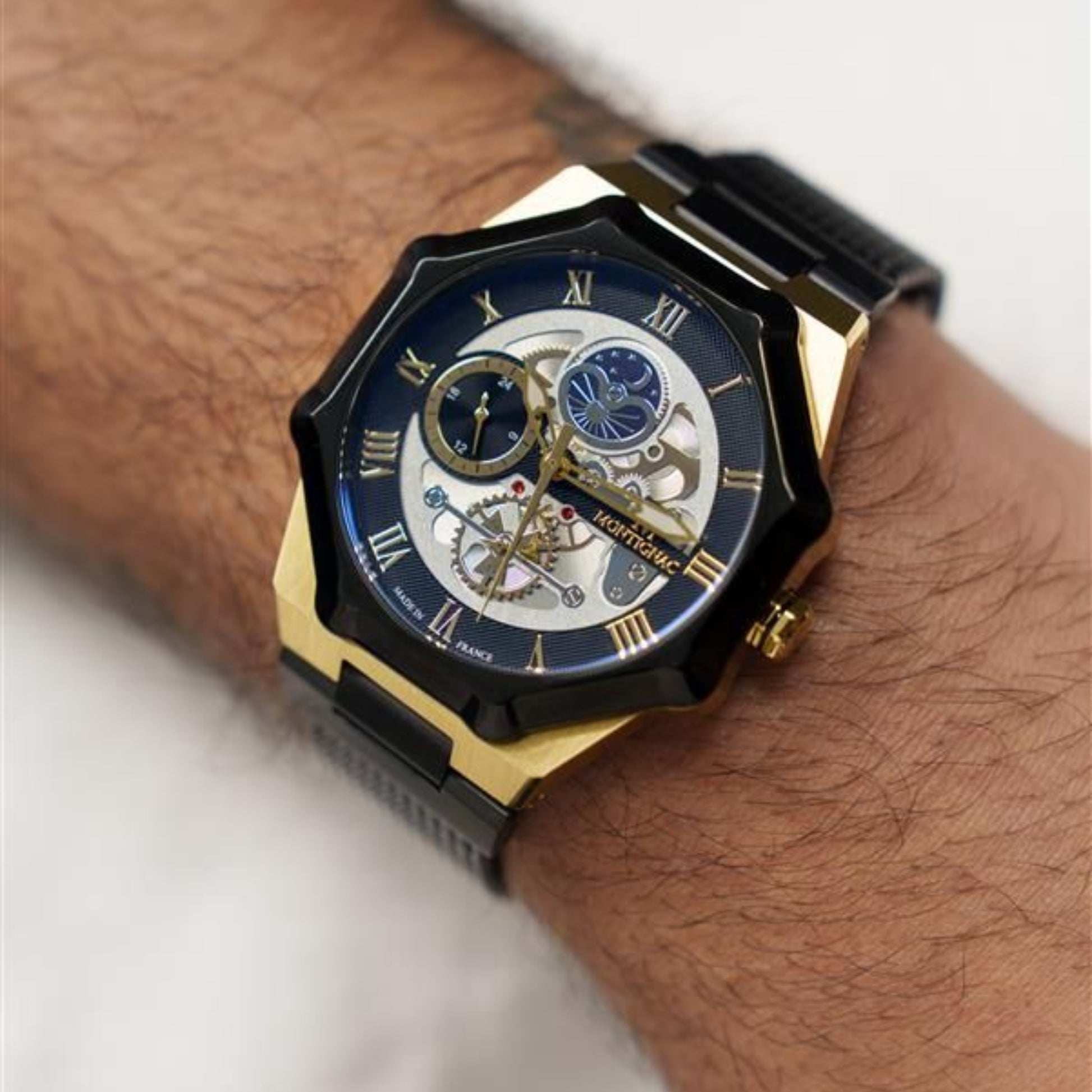 Il Montignac MOW1210 è un orologio raffinato e contemporaneo che incarna l’essenza della collezione Sentinel, ispirata alla vigilanza e all’armonia architettonica delle torri ottagonali di Montignac. La cassa ottagonale da 44 mm in acciaio inox dorato cattura la luce con eleganza e conferisce al segnatempo un carattere deciso e sofisticato.
