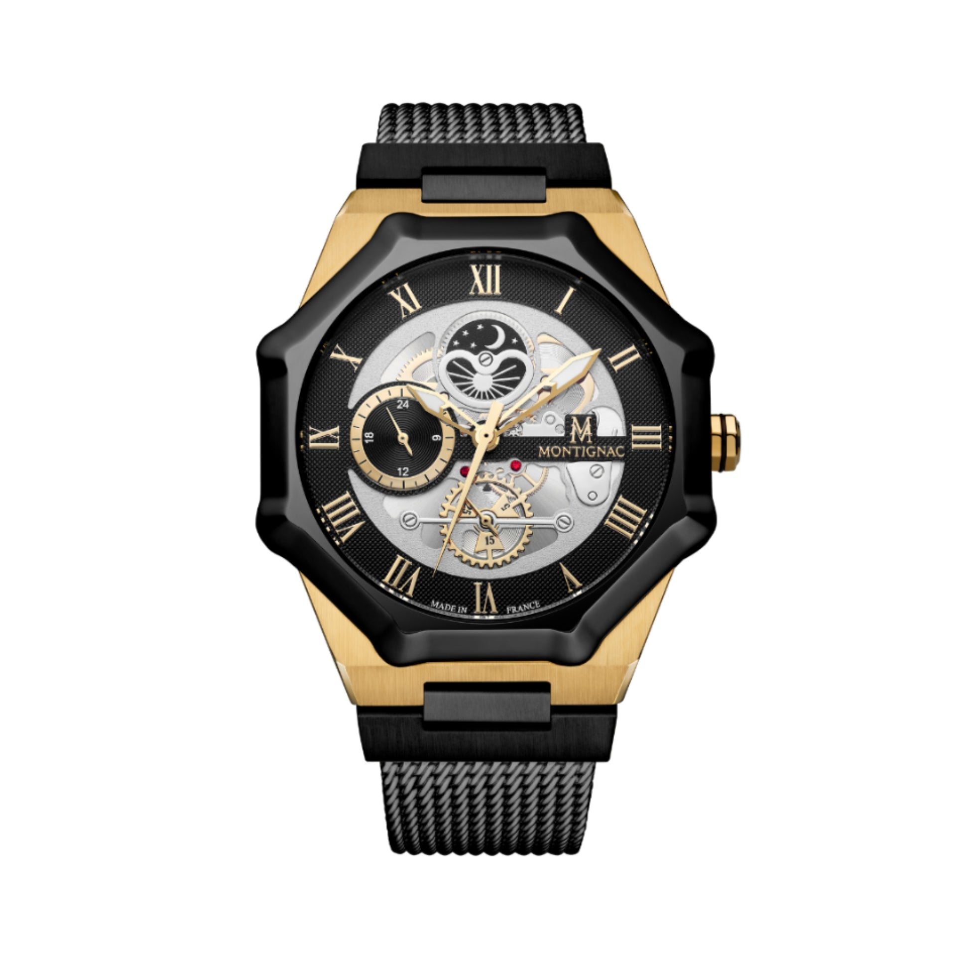 Montignac Sentinel – Octagon MOW1210 – Orologio da Uomo in Acciaio Oro con Quadrante Nero e Cinturino Mesh
