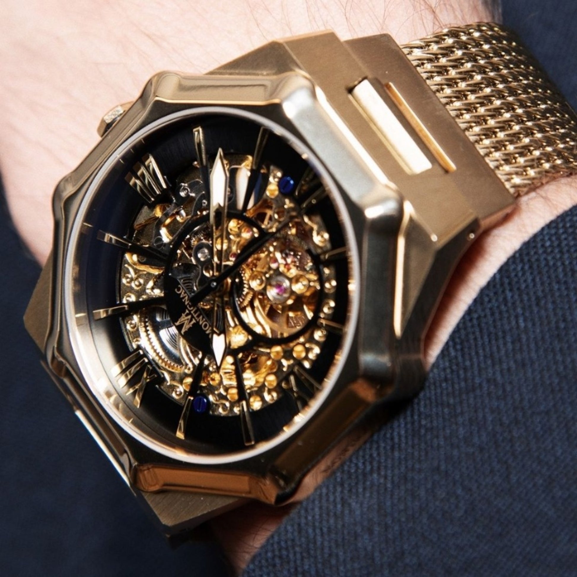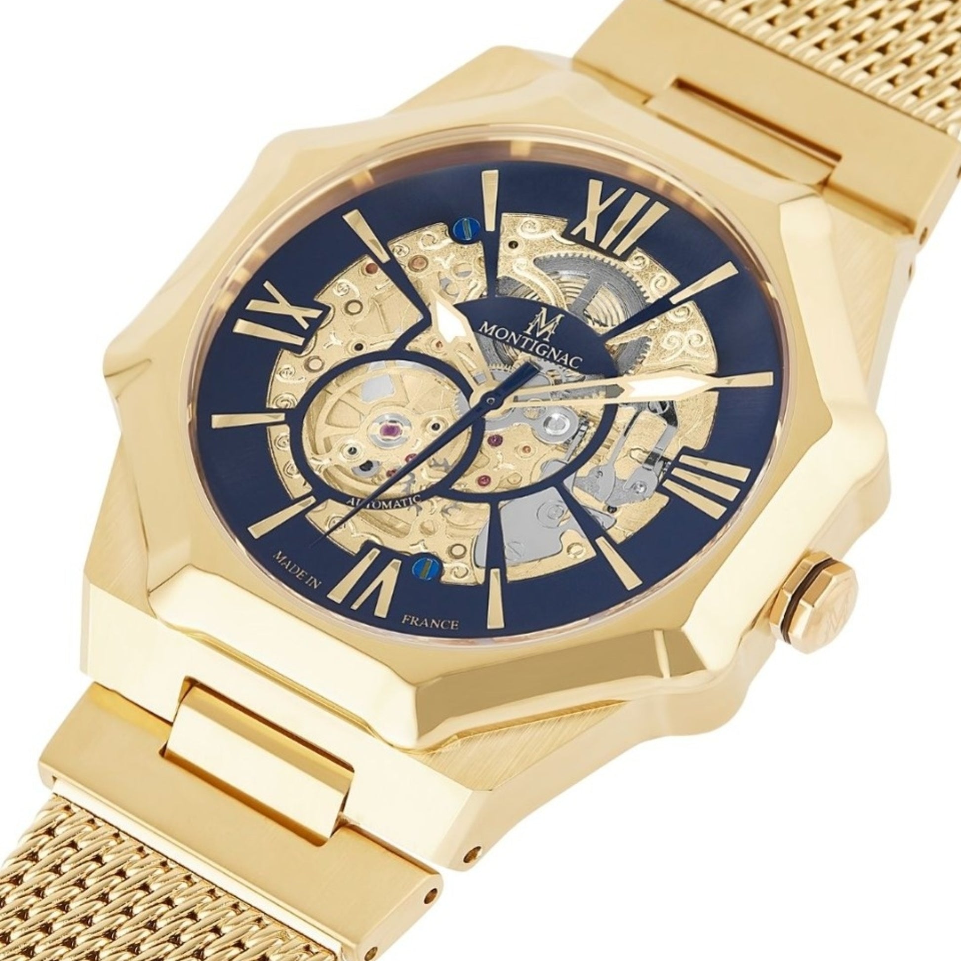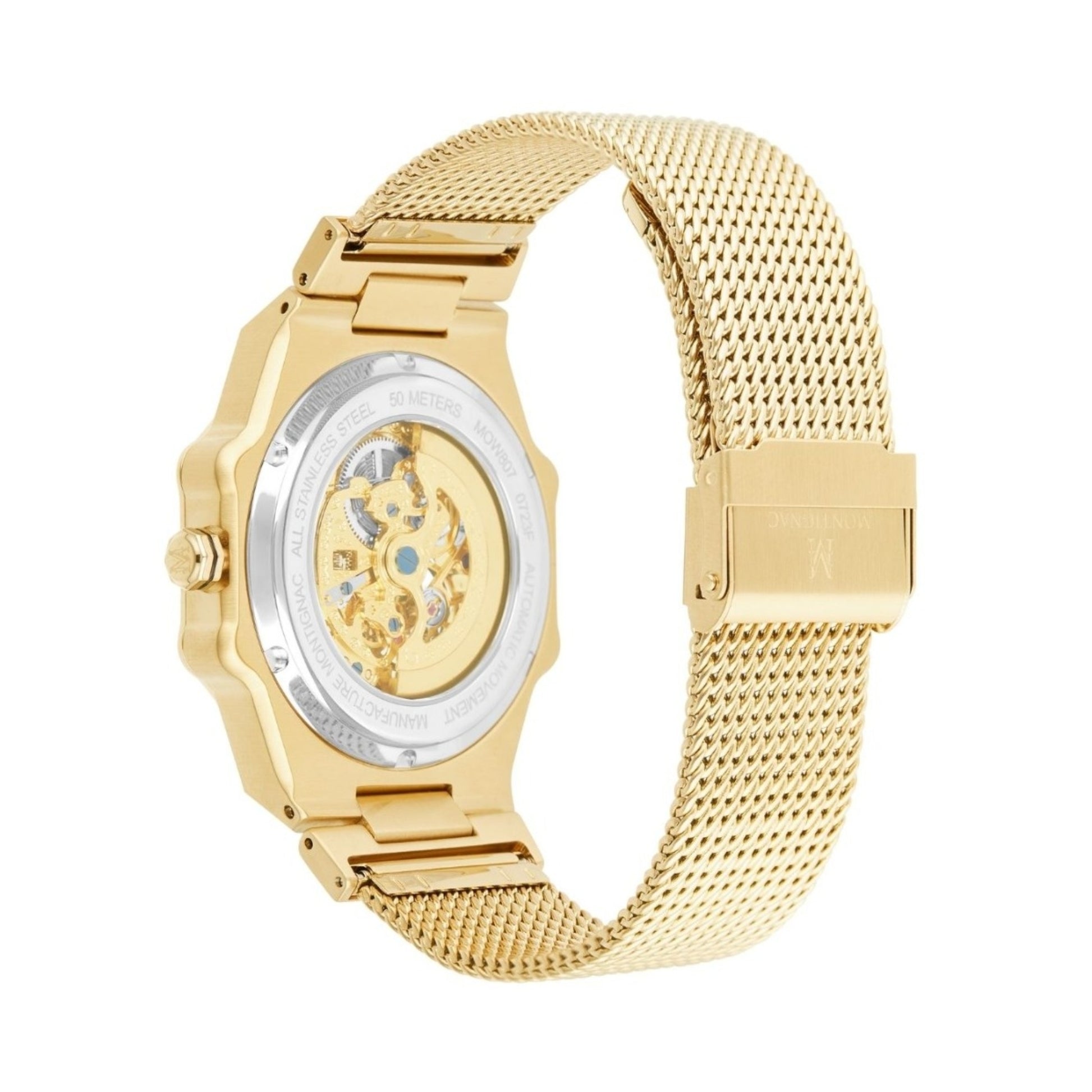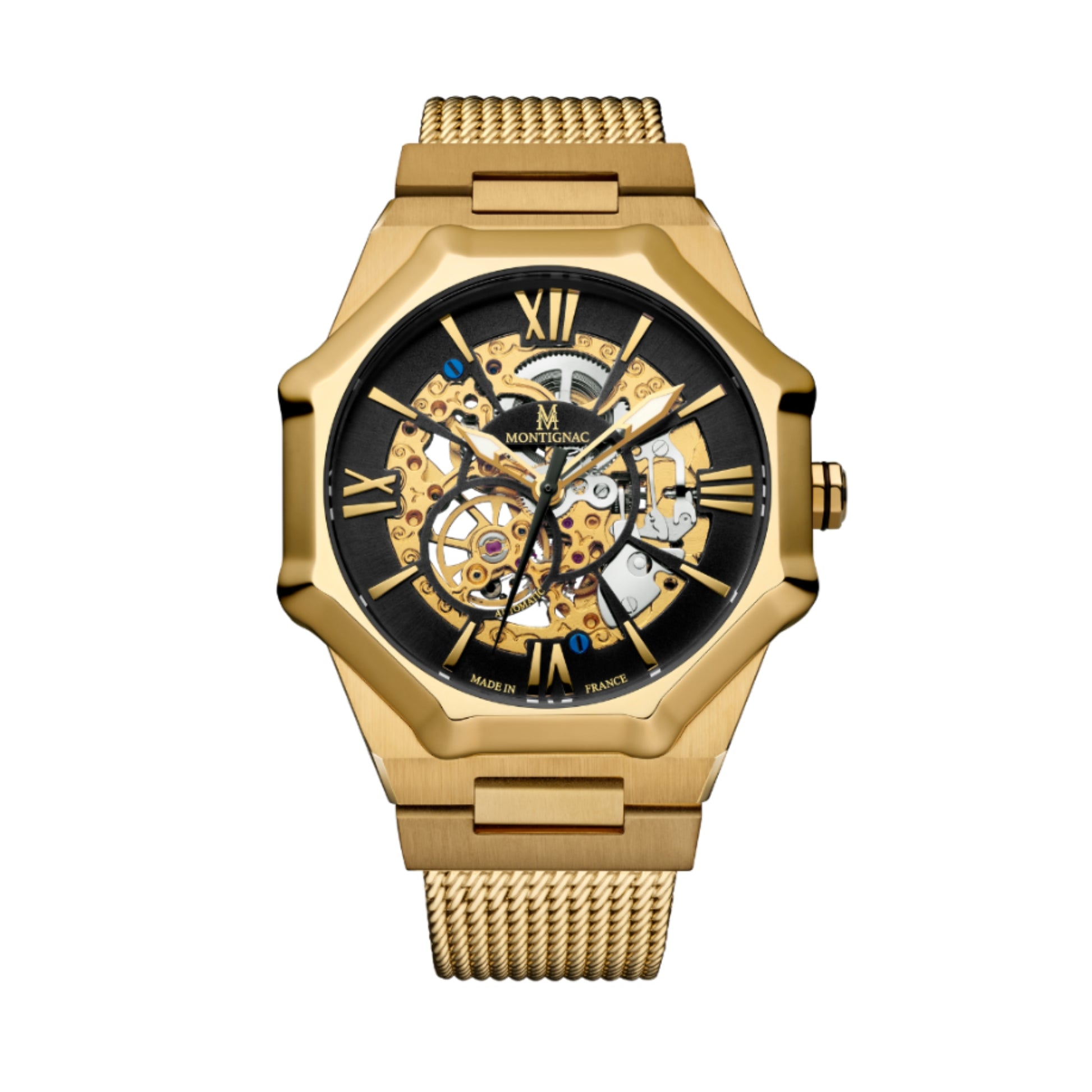 Il Montignac Sentinel MOW807 è un orologio dal design audace e prestigioso, progettato e assemblato in Francia. Caratterizzato da una cassa ottagonale da 44 mm color oro e da un elegante cinturino in maglia milanese dorata, questo modello unisce potenza estetica e raffinatezza tecnica.