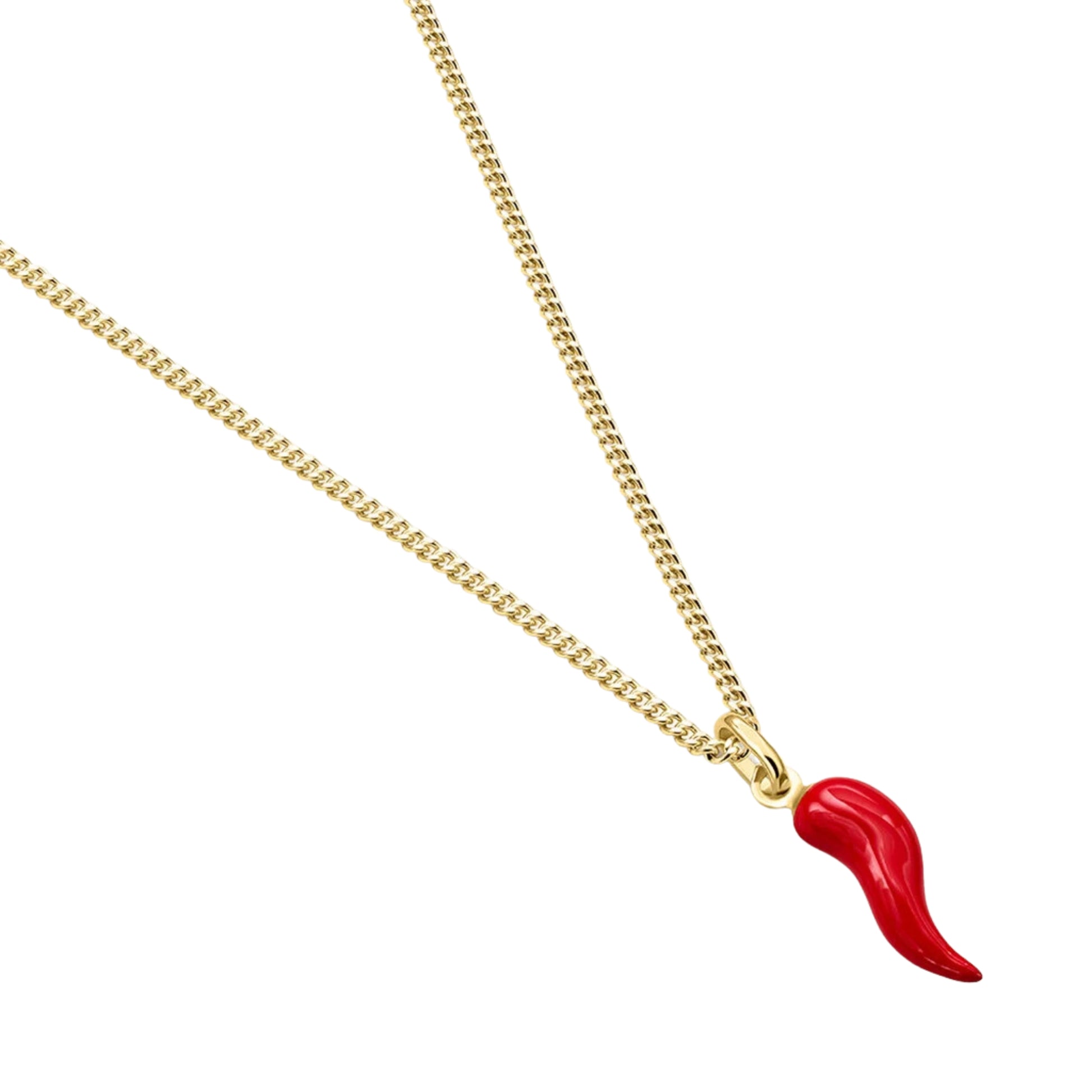 Il Pendente Cornetto Poème di Stroili è un raffinato amuleto di buon auspicio, simbolo di fortuna e protezione. Realizzato in oro giallo 375/1000, questo pendente unisce l’eleganza del metallo prezioso al tocco vivace dello smalto rosso, che ne esalta la forma tradizionale del cornetto portafortuna.